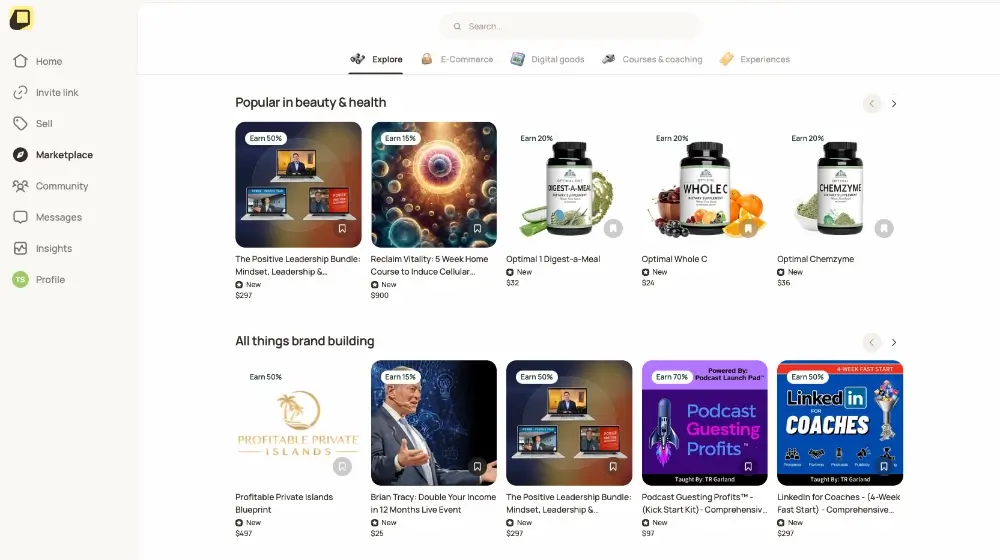 Produkte und Angebote von anderen Creators können im Marktplatz gefunden und dann mit einem Klick dem eigenen Angebot oder Funnel hinzugefügt werden. Kurse, eCommerce Produkte, Merch, Events, alles kann beliebig kombiniert werden in einem einzigen hochkonvertierenden Funnel.